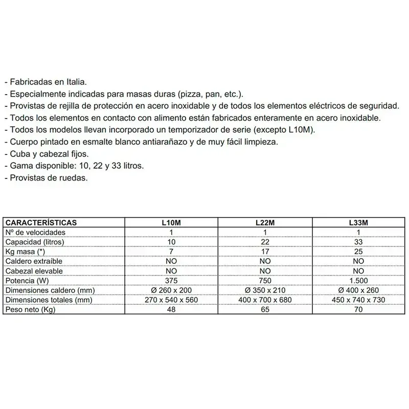 📦 Contenido del paquete Este modelo L10M cuenta con un motor monofásico de 375W (220V) y una capacidad de cuba de 10 litros, permitiendo procesar hasta 7 kg de masa por ciclo. El diseño de cuba y cabezal fijos asegura una estructura sólida y estable durante el amasado. Está equipada con rejilla de protección en acero inoxidable y todos los dispositivos de seguridad eléctrica necesarios. Sus dimensiones compactas de 270x540x560 mm y la inclusión de ruedas de serie facilitan su ubicación y movilidad dentro de obradores, cocinas centrales, hoteles o caterings.