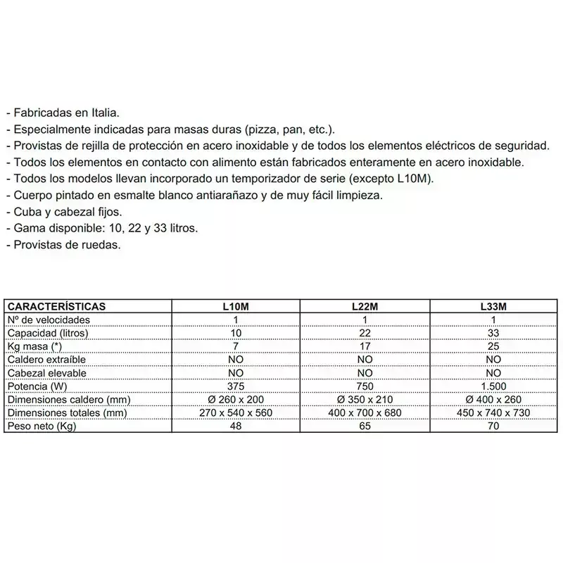 📦 Contenido del paquete El modelo L33M es el de mayor capacidad de la serie, equipado con un potente motor monofásico de 1500W (220V) y una cuba con capacidad de 33 litros, permitiendo una producción máxima de hasta 25 kg de masa por ciclo. Al pertenecer a la serie de cuba y cabezal fijos, ofrece una estabilidad y resistencia máxima durante el amasado de grandes volúmenes de masas densas. Incorpora de serie un temporizador para automatizar los procesos de trabajo, rejilla de protección en acero inoxidable y todos los dispositivos de seguridad eléctrica reglamentarios. Sus dimensiones totales son de 450x740x730 mm e incluye ruedas de serie para facilitar su movilidad dentro del obrador o la cocina central.