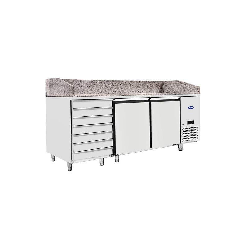 Mesa de Preparación de Pizzas Profesional 2 Puertas + 7 Cajones - Encimera Mármol