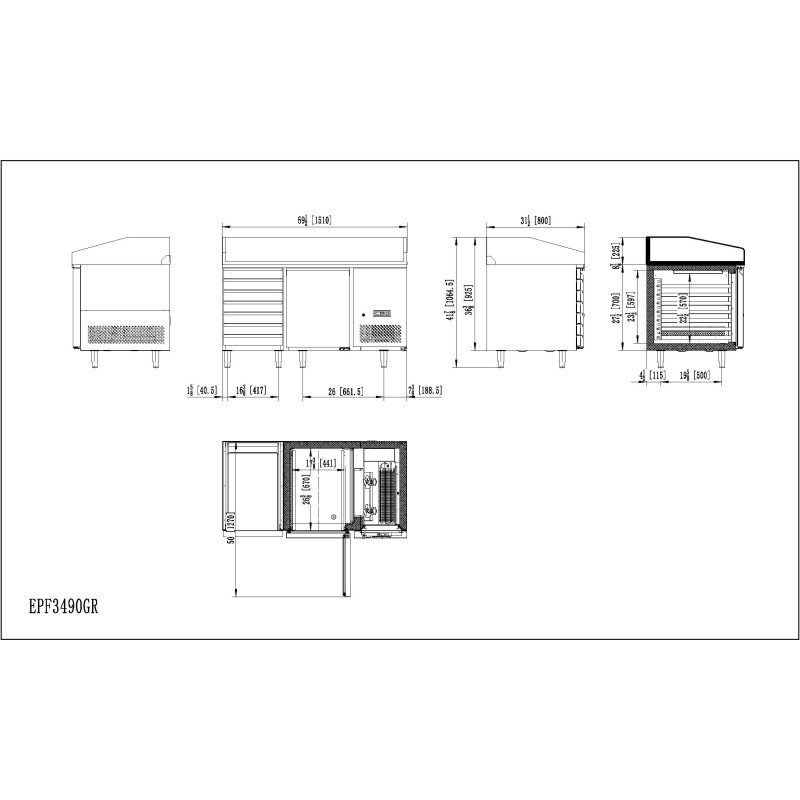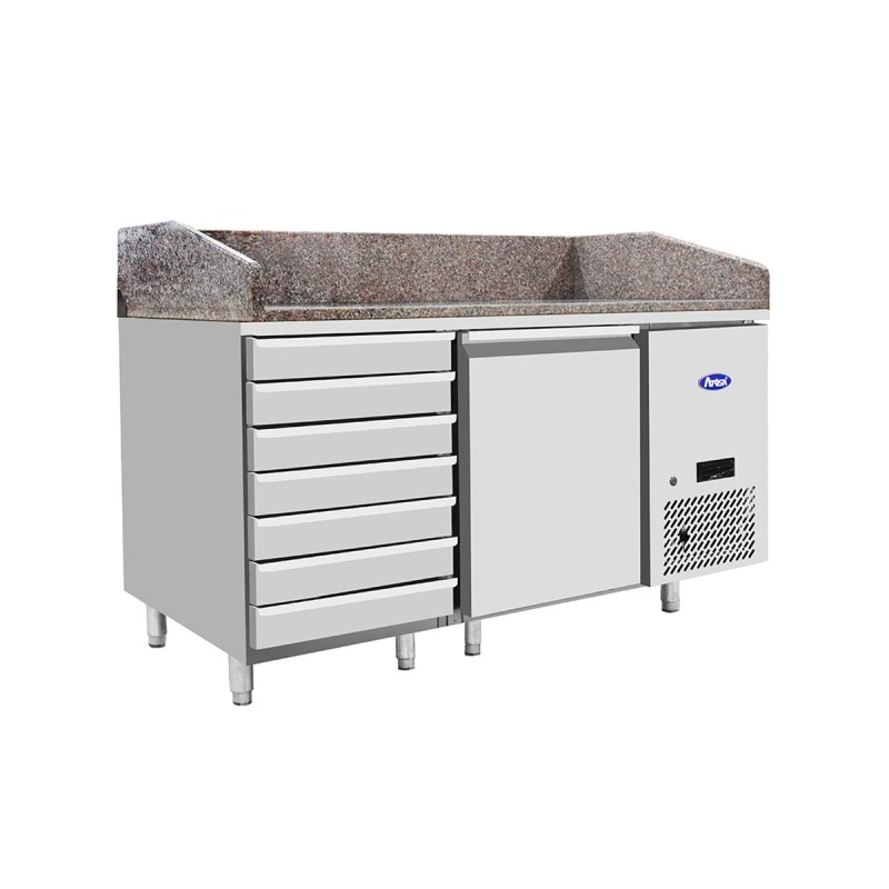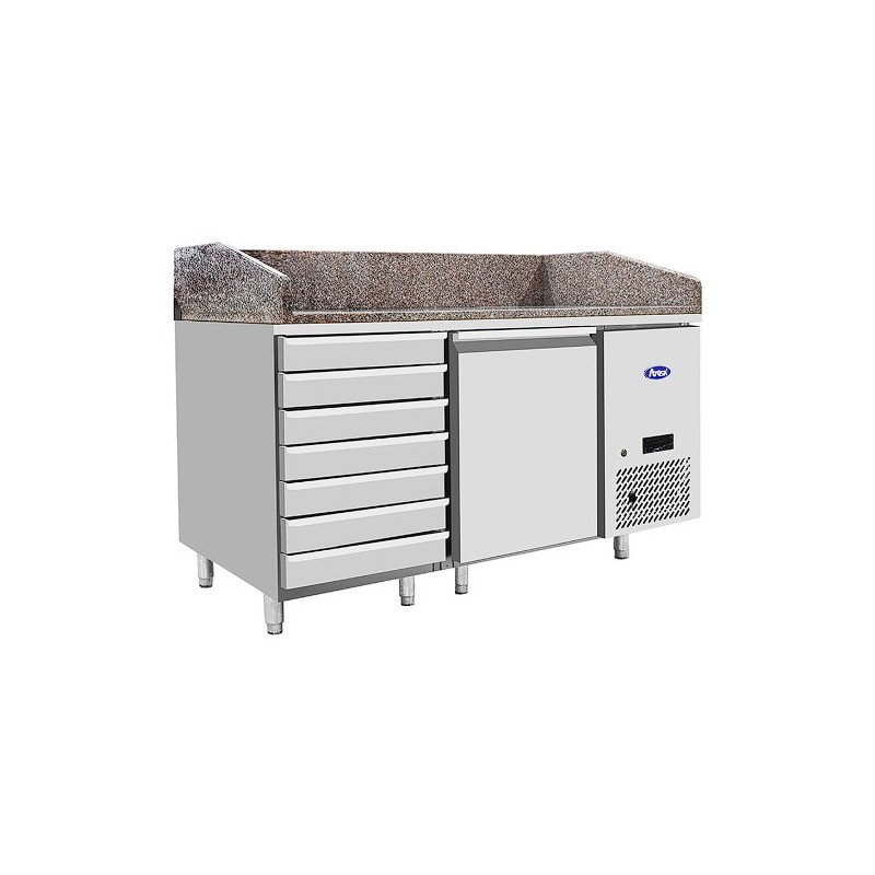 🌟 Descripción General Esta mesa de Atosa (referencia EPF3490-GR) es la solución perfecta para locales que necesitan una estación de preparación completa en un formato más reducido de 1,5 metros. Su diseño inteligente optimiza el espacio al combinar 1 puerta refrigerada para ingredientes frescos con un bloque lateral de 7 cajones neutros, diseñados específicamente para el reposo y fermentación de las bolas de masa a temperatura ambiente. La encimera de mármol de alta calidad remata el conjunto, ofreciendo una superficie de trabajo profesional que mantiene la masa fría y facilita el estirado.