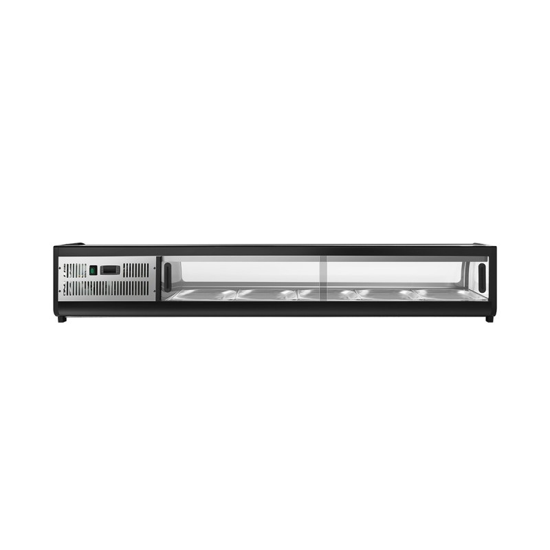 🚀 Características Destacadas Presenta un sistema de refrigeración estática que evita que el producto se reseque, manteniendo la frescura y textura del sushi durante todo el servicio. Su rango de temperatura de +2ºC a +8ºC es ideal para la normativa sanitaria de pescado crudo. Incluye iluminación LED de 6500K para un blanco puro que realza los colores naturales del alimento. Utiliza gas ecológico R-600a y destaca por su diseño elegante y bajo perfil que no obstruye la vista del cliente.