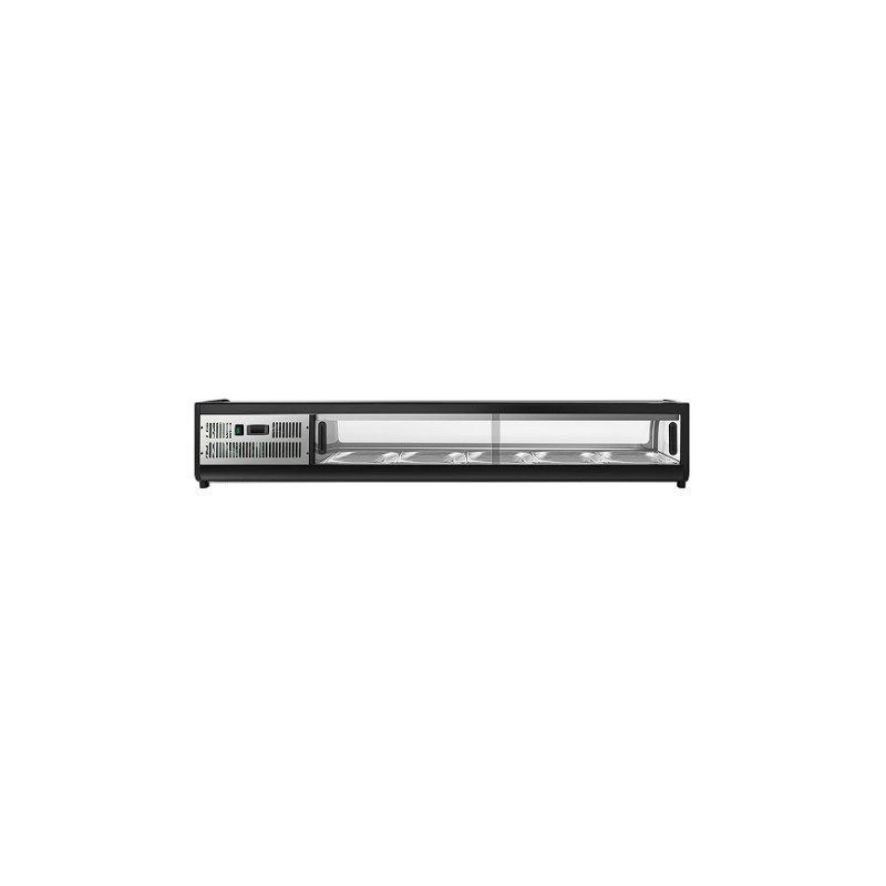👨🍳 Nota del experto: Esta vitrina es la joya de cualquier barra de comida japonesa o buffet de autor. La clave es su refrigeración estática; a diferencia de las ventiladas, esta no reseca el arroz ni el pescado, lo cual es crítico para servir un sushi de calidad superior. Su tamaño de poco más de un metro es perfecto para barras de tamaño medio, ofreciendo una presencia visual imponente que invita al cliente a pedir. 🍣