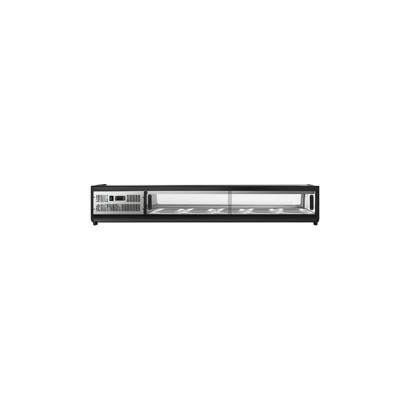👨🍳 Nota del experto: Este modelo de 133,6 cm es el más equilibrado para barras con un volumen de trabajo medio-alto. Sus 5 cubetas permiten separar claramente diferentes tipos de rolls y niguiris, evitando la mezcla de sabores y olores. Al igual que su hermana pequeña, su gran ventaja es el frío estático, que garantiza que el arroz se mantenga tierno y el pescado con su brillo original durante horas de servicio. Es una pieza central que vende el producto por sí sola. 🍱