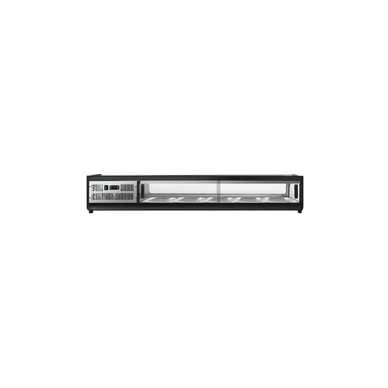 👨🍳 Nota del experto: Este modelo de 6 cubetas es el "buque insignia" para restaurantes especializados en sushi o barras de tapas de lujo. Sus más de 1,5 metros de longitud crean un escaparate visual que capta la atención del cliente desde que entra al local. Es la opción más eficiente cuando tienes una oferta de producto muy variada, permitiendo una organización impecable sin que los ingredientes se toquen entre sí. 🏆