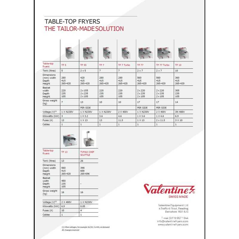 La Valentine TF55 Turbo es la solución de doble cuba de alto rendimiento para cocinas que necesitan máxima agilidad en el mínimo espacio. Fabricada en Suiza, esta freidora de sobremesa de 2 cubas independientes está diseñada para aguantar el ritmo de un servicio intenso, garantizando que el aceite recupere su temperatura en tiempo récord entre fritura y fritura. Su chasis robusto y su capacidad de desmontaje total la convierten en la herramienta más práctica para mantener la higiene operativa sin perder ni un minuto al cierre del servicio.