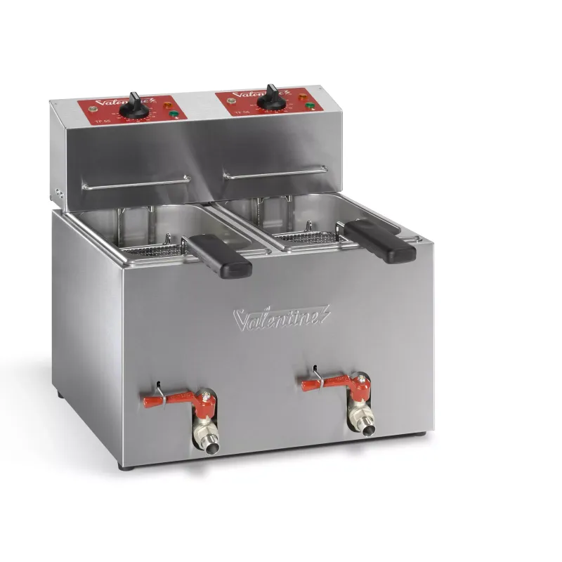 Como hostelero, sabes que lo más difícil es mantener el ritmo cuando entran comandas seguidas de congelado. La Valentine TF55 Turbo destaca por su estabilidad térmica; sus 7,2kW de potencia combinada te permiten sacar raciones perfectas sin que el aceite se enfríe. Es una máquina robusta que aguanta el trato duro y que, al final del turno, se desmonta por completo para una limpieza impecable. Es la inversión inteligente para quienes necesitan la versatilidad de dos cubas con la potencia de una freidora industrial.