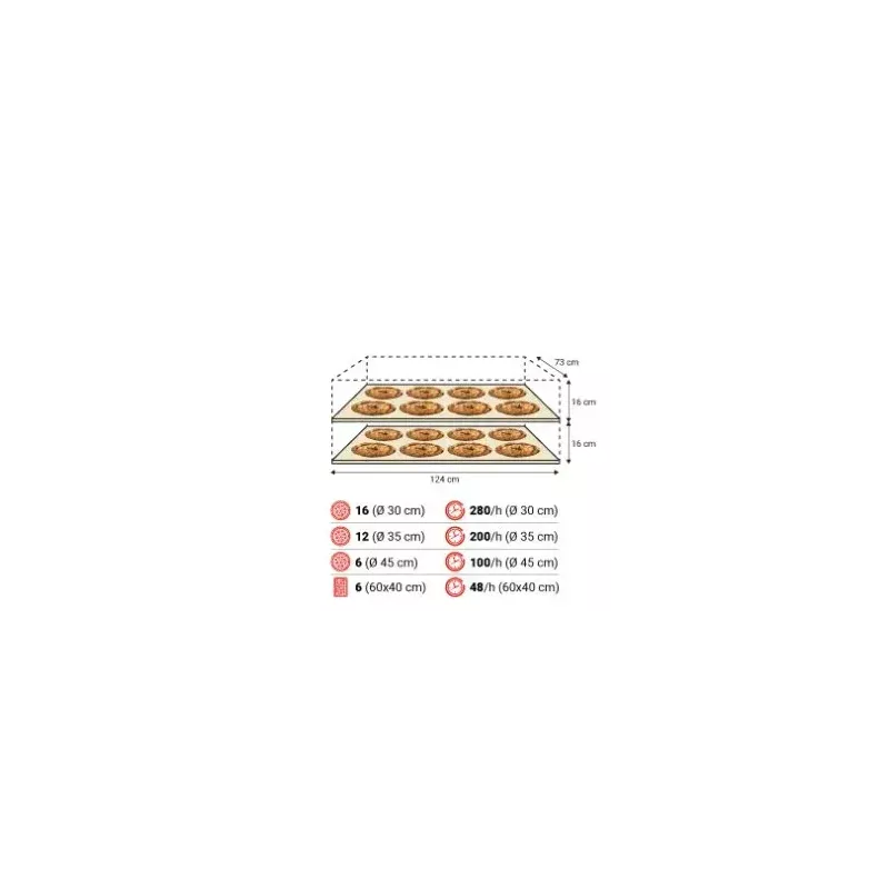 📋 Datos Técnicos Importantes Aquí tienes las cifras que definen su rendimiento: Temperatura Máxima: Alcanza los 450°C, indispensable para un horneado rápido y profesional. Capacidad de Producción: 16 Pizzas (Ø 30cm), 6 Pizzas (Ø 45cm) o 6 Bandejas (60x40cm) simultáneamente en formato doble. Potencia Máxima: 24 kW (Con tecnología Eco-Standby para reducir drásticamente el consumo real entre comandas). Dimensiones del Conjunto: 1660 x 1443 x 1870 h mm aprox. Medidas de la Cámara: 1245 x 735 x 160 mm (x2 cámaras). Conexión: Trifásica 400V.