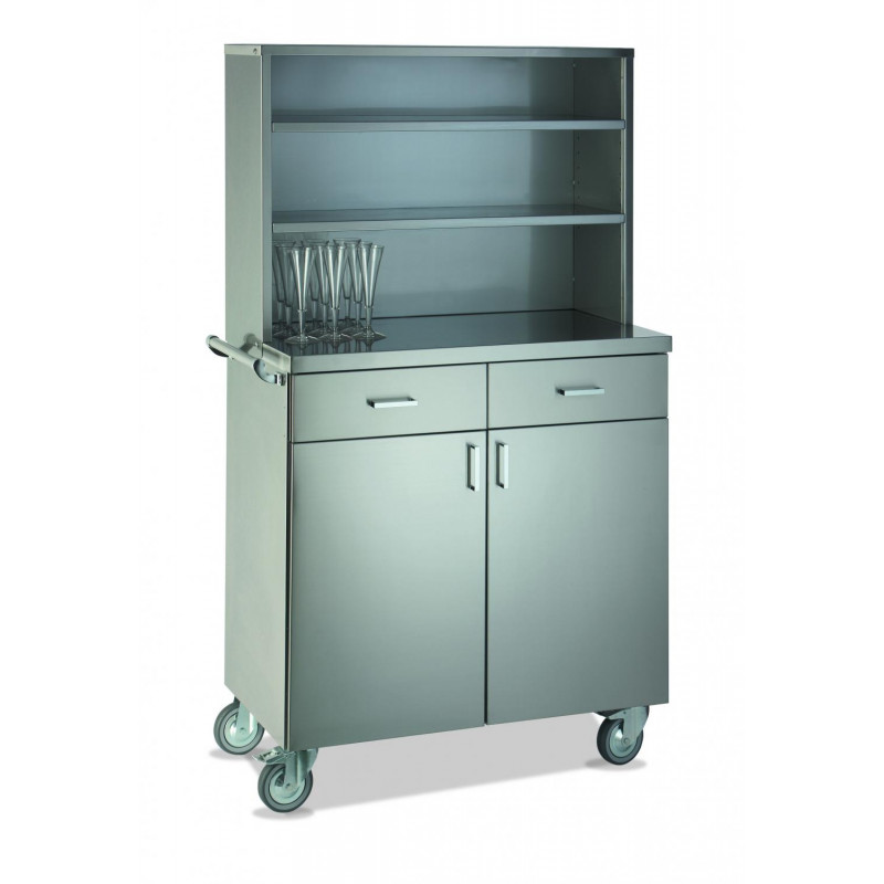 Mueble apto para exterior para servicio de camareros, es moderno y fabricado íntegramente en acero inoxidable AISI 304. La parte superior abierta compuesta por dos estantes y dos cajones para organizar cubiertos y dos puertas inferiores con estantes internos regulable en altura. Montado sobre ruedas de Ø125mm, 2 con freno y equipado con un práctico asa de empuje. Se puede pedir un estante opcional para copas de vino, para ello solicitar presupuesto.