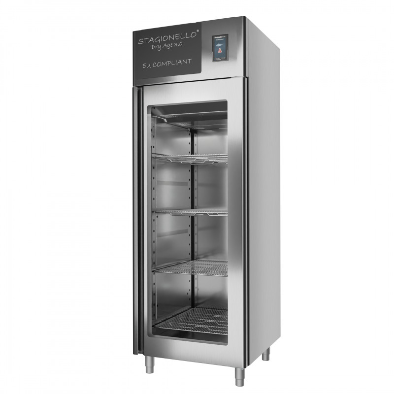 Este sistema original patentado es una vitrina multifuncional de alta gama diseñada para el envejecimiento en seco (Dry-Age) y la conservación de carnes y pescados de forma natural, continua y segura, cumpliendo con las más altas exigencias de la EFSA (Autoridad Europea de Seguridad Alimentaria).